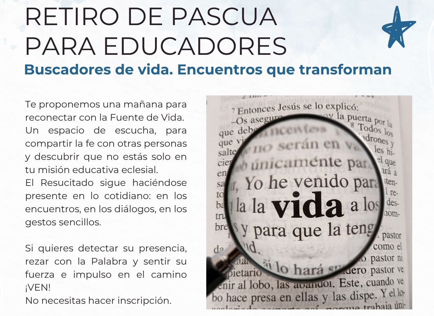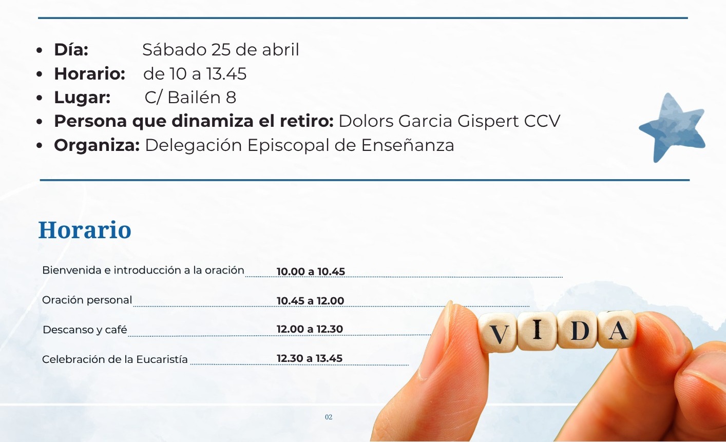 Te proponemos una mañana para reconectar con la Fuente de Vida. Dinamiza el retiro: Dolors García Gispert CCV 25 de abril de 2026, de 10:00 a 13:45 h. Arzobispado de Madrid, calle Bailén nº 8