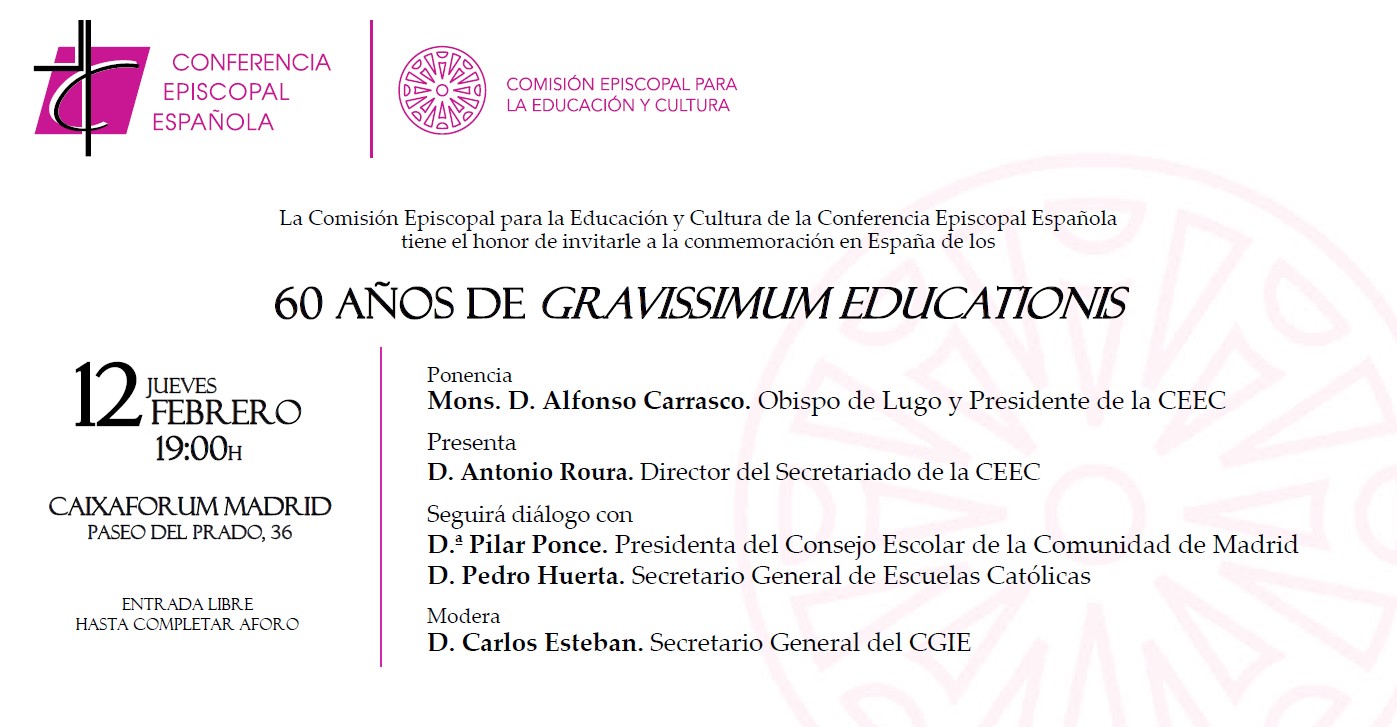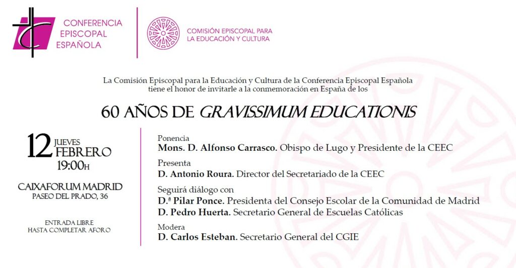 60 Años de Gravissimum Educationis por José Manuel Mansilla Morales | Feb 11, 2026 | Noticias | 0 Comentarios La Conferencia Episcopal invita a participar a la conmemoración del 60 aniversario de la declaración del Concilio Vaticano II sobre la educación (12 de febrero, 19 h, Caixaforum) . Comparte esto: Haz clic para compartir en X (Se abre en una ventana nueva) X Haz clic para compartir en Facebook (Se abre en una ventana nueva) Facebook Haz clic para compartir en WhatsApp (Se abre en una ventana nueva) WhatsApp Haz clic para compartir en LinkedIn (Se abre en una ventana nueva) LinkedIn Haz clic para imprimir (Se abre en una ventana nueva) Imprimir Haz clic para enviar un enlace por correo electrónico a un amigo (Se abre en una ventana nueva) Correo electrónico