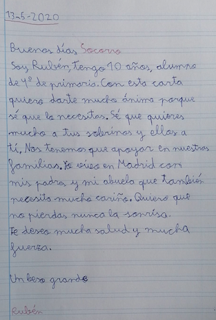 Destacar y agradecer la implicación del conjunto de la comunidad educativa: equipo directivo, profesorado, familias y alumnados en la realización de todo el material: cartas, dibujos, canciones, postales… elaborados para enviar a la Residencia de ancianos Alba, dicha propuesta ha sido muy bien acogida porque les he transmitido la importancia de acompañar y reconocer el valor de nuestros mayores, en estos momentos difíciles. Como dice el Papá Francisco: “Hoy quisiera decirles que también los ancianos son el presente y el mañana de la Iglesia. Sí, son también el futuro de una Iglesia que, junto a los jóvenes, ¡profetiza y sueña! Por esto es tan importante que los ancianos y los jóvenes hablen entre