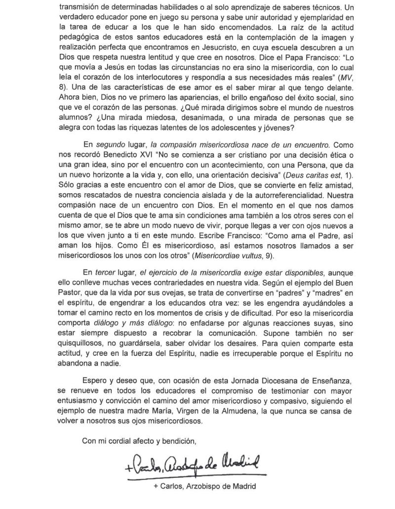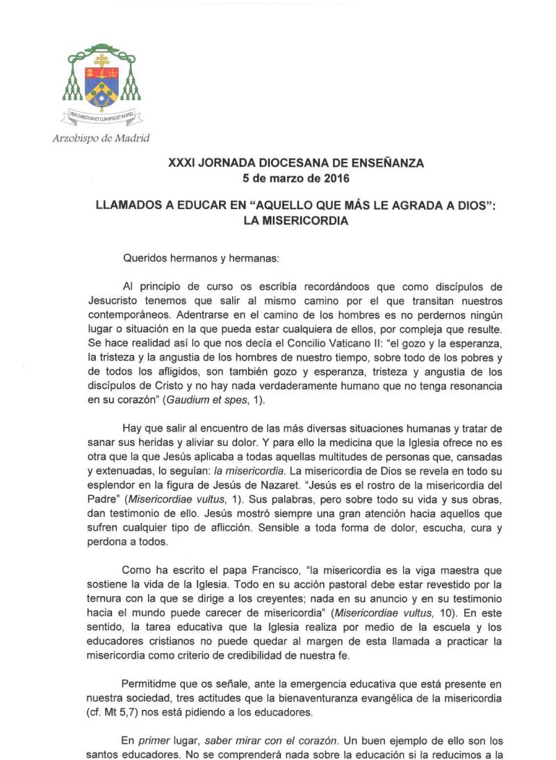 Mons. D. Carlos Osoro escribe una carta reflexionando y animando a participar en la XXXI Jornada Diocesana de Enseñanza, que se celebra el 5 de marzo de 2016 con el lema «Llamados a educar en ‘aquello que más le agrada a Dios’: La misericordia’