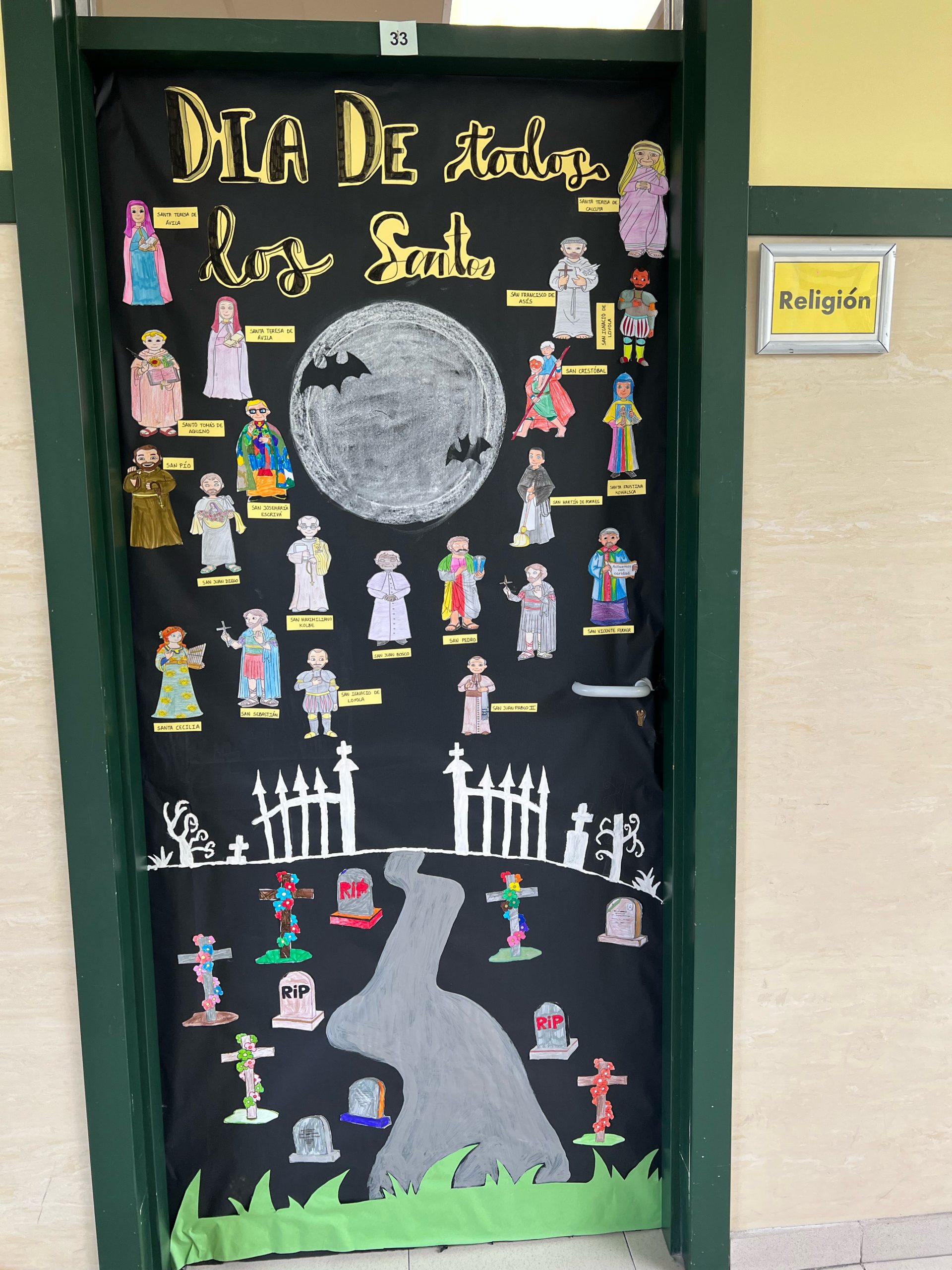 Han decorado la puerta de clase con papel continuo negro, los estudiantes de 4º han pintando las cruces y lápidas, los de 5º el título, santos y el caminito y los de 6º las vallas de entrada al cementerio y santos. Una idea original para explicar el sentido de esta festividad.