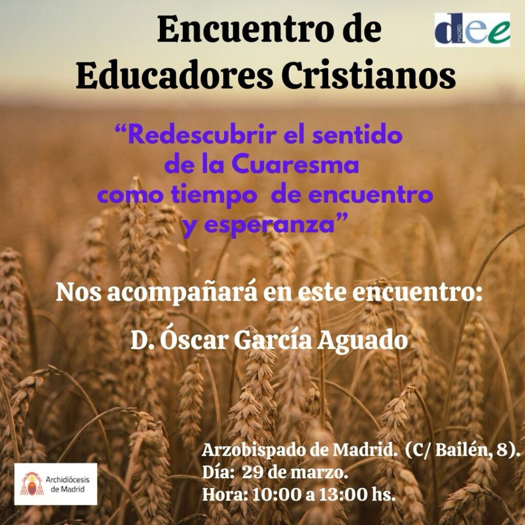 EL 29 de marzo, de 10 a 13 h, en el Arzobispado (C/ Bailén, 8), mantendremos un encuentro más con los educadores cristianos que deseen asistir. En esta ocasión con la presencia de D. Óscar García Aguado, reflexionando sobre el tiempo cuaresmal.