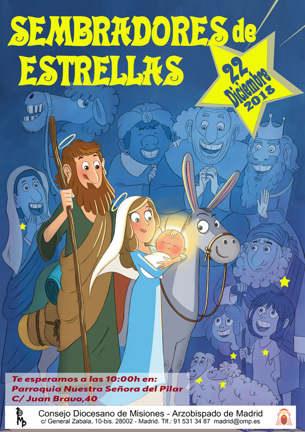 La Delegación de Misiones, junto con Cristianos sin Fronteras, celebra desde 1976 la Jornada de Sembradores de Estrellas en vísperas de la Navidad. Este año, el 22 de diciembre en la Parroquia de Nuestra Señora del Pilar. Los pequeños reciben un globo con helio para que envíen mensajes de paz y de felicitación de la Navidad. En ese breve encuentro se cantan villancicos y los niños son enviados a llevar la felicitación de los misioneros madrileños por las calles de Madrid.