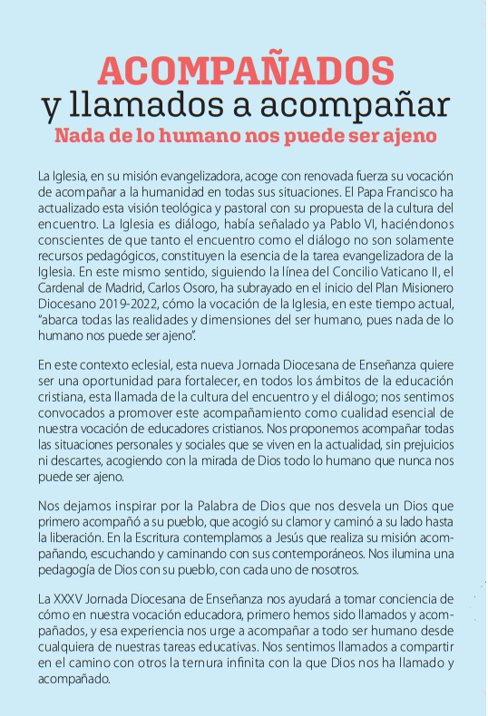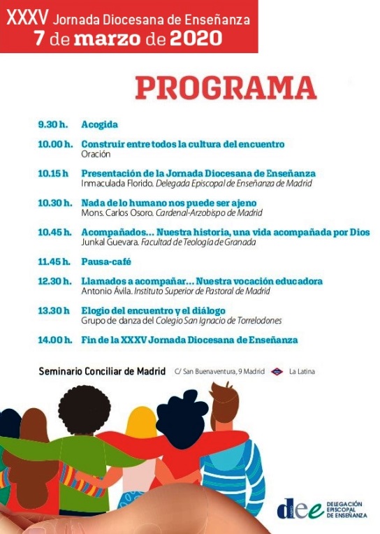 XXXV Jornada Diocesana de Enseñanza Sábado, 7 de marzo de 2020 (9:30 h) Seminario Conciliar de Madrid: Calle San Buenaventura, 9 Descarga aquí: el cartel y el díptico de la Jornada Comparte esto: Haz clic para compartir en X (Se abre en una ventana nueva) X Haz clic para compartir en Facebook (Se abre en una ventana nueva) Facebook Haz clic para compartir en WhatsApp (Se abre en una ventana nueva) WhatsApp Haz clic para compartir en LinkedIn (Se abre en una ventana nueva) LinkedIn Haz clic para imprimir (Se abre en una ventana nueva) Imprimir Haz clic para enviar un enlace por correo electrónico a un amigo (Se abre en una ventana nueva) Correo electrónico